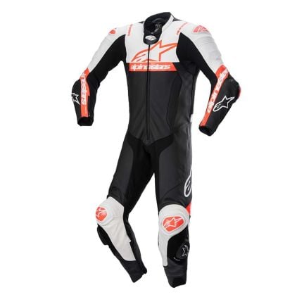Do you feel the need for speed? The Missile V2 is a great racing suit by Alpinestars for real speed demons. One-piece racing suits are perfect for high-speed riding, track days, races and for the days where all you want to do is ride the best lines and set the fastest times. This Race/Sport one-piece motorcycle suit for Men is, just as the name suggests, made of one piece. Compared to two-piece racing suits, a one-piece racing suit is the safest possible option, because there is no risk of the top part coming loose from the bottom in case of a high-speed crash. There are no two ways about it, if you want maximum protection: hoist yourself in this Black, Red, White Alpinestars 1-piece leather motorcycle racing suit!